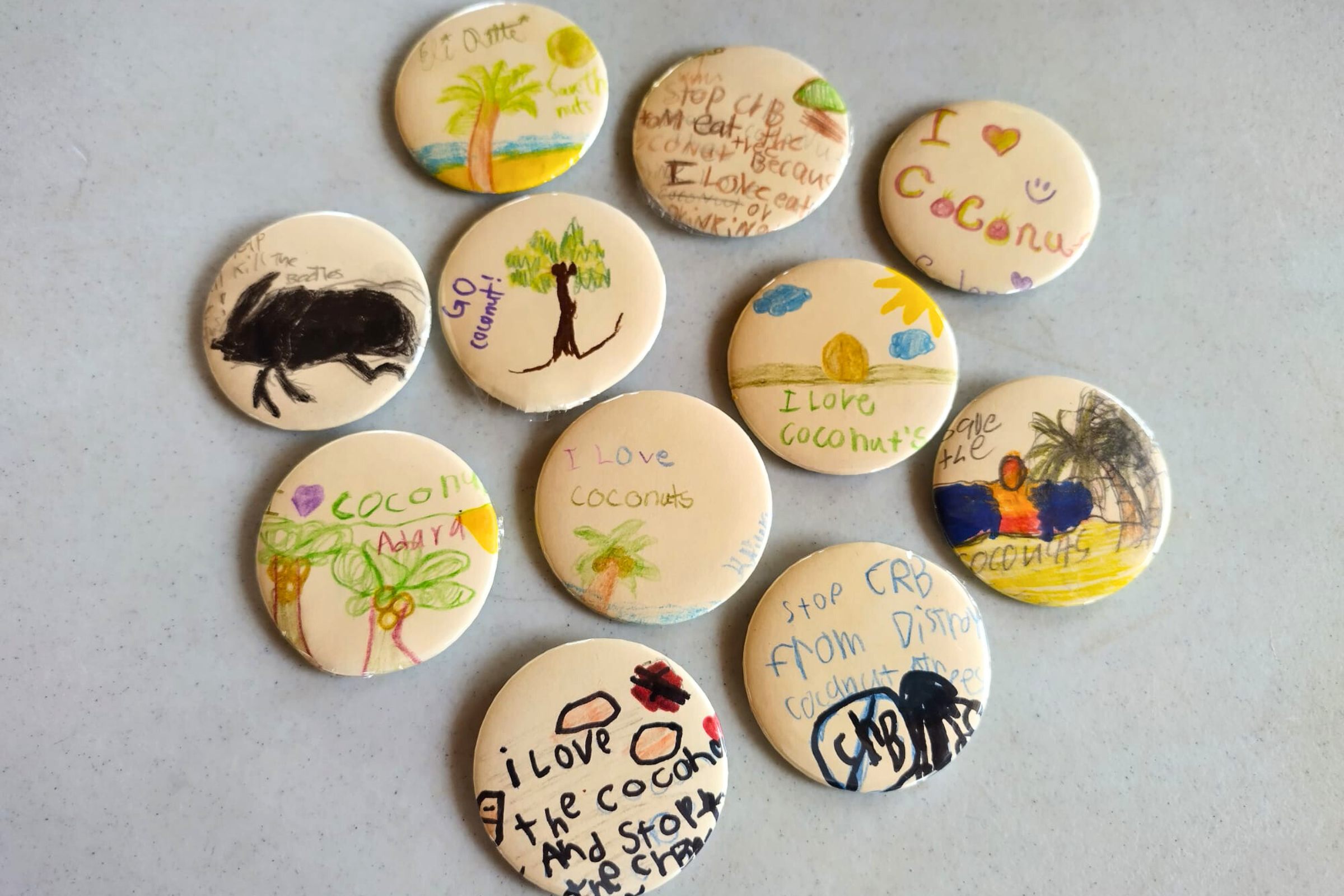These short phrases are meant to have a rippling impact thanks to the 80 Moloka‘i fourth graders who created colorful campaign buttons to help raise awareness about the Coconut Rhinoceros Beetle (CRB) at their Keiki Earth Day event in April.