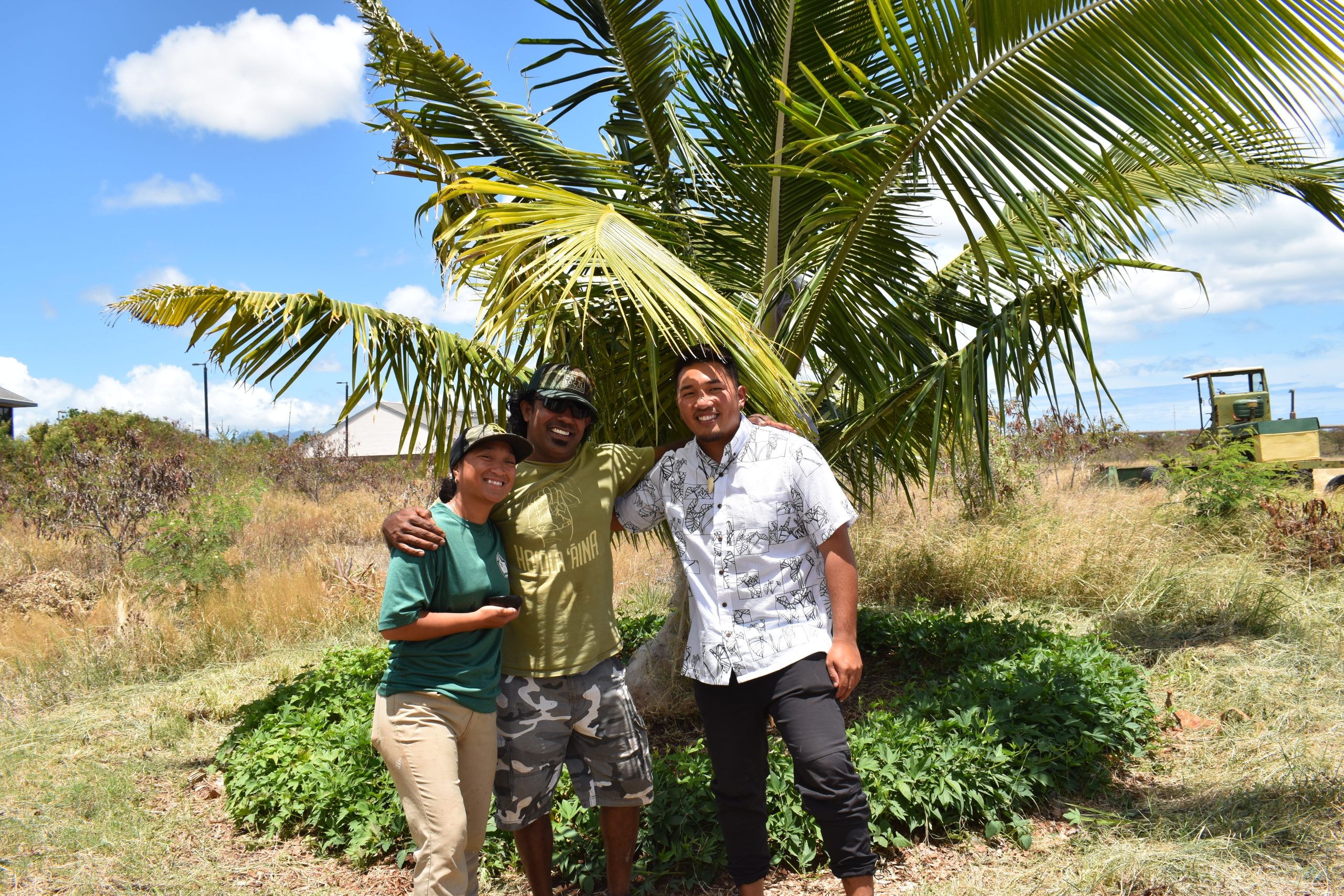 Kehau Kahele-Madali, Indrajit Gunasekara and Jesse Mikasobe-Kealiinohomoku are working to safeguard niu genetic diversity and cultivate niu on O‘ahu, Maui and Hawai‘i Island. One of the uluniu they care for is at UH West O‘ahu. | Noelle Fujii-Oride, Overstory